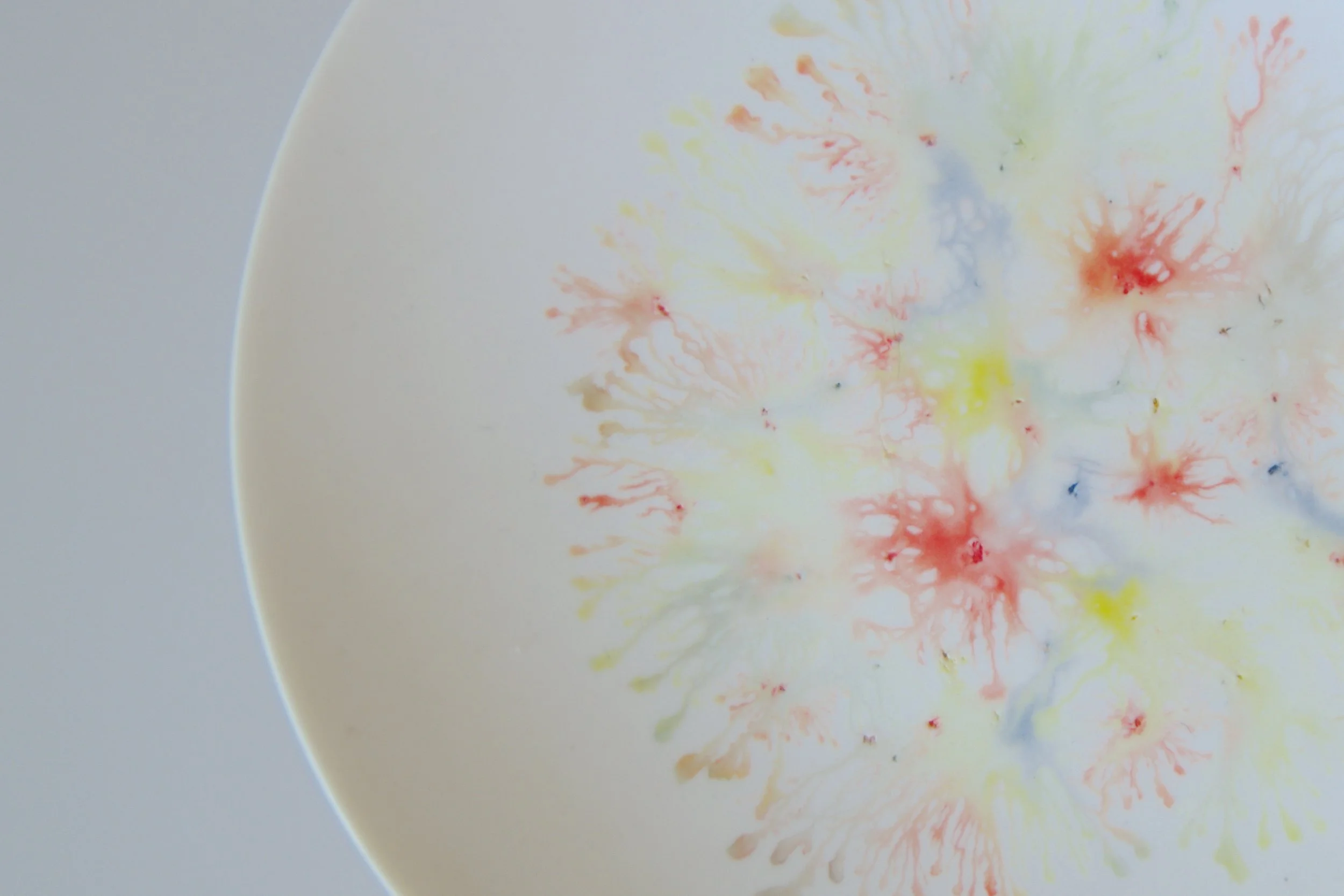 白い磁器に枝葉のように広がる色は花を、透明でゆらぎのあるガラスは水を連想させます。花に水を与えるように、磁器にガラスを組み合わせる事で生じる新しい花を是非ご参照ください。